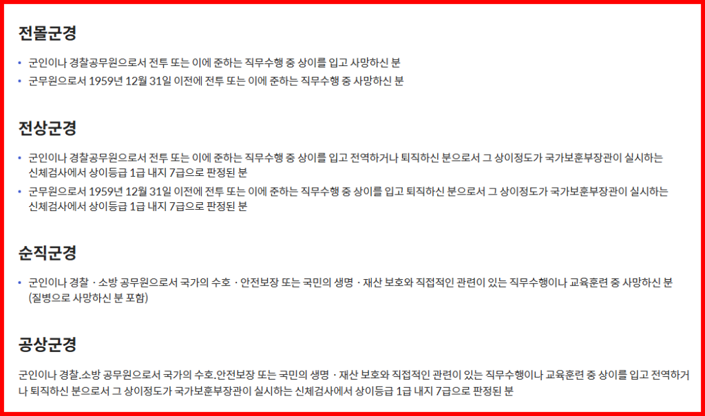 - 핵심 대상: 전투 참여자, 순직·공상 군경/공무원, 훈장 수훈자 등
